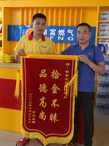 6月27日,銀富瑞華燃氣天然氣加氣站站長袁建輝(右),代表客戶許益先生將“拾金不昧,品德高尚”的錦旗交到加氣員田志手中,這是怎么回事呢?6月18日下午四點多鐘,田志在上班現場拾到手機一部,詢問現場客戶沒有找到失主。通過撥打手機里聯系電話找到了家住中心城區康富南路的許先生。許先生手機里有許多重要的資料,失而復得十分高興,對田志小伙子拾金不昧的精神贊不絕口。如是他制作了錦旗送到加氣站以表謝意。剛好田志沒有上班,許先生拜托袁站長一定轉交田志。如是有了開頭的一幕。